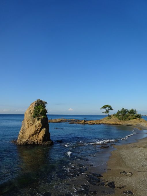 海から突き出た岩「立石」と、「梵天の鼻」と呼ばれる小さな岬、